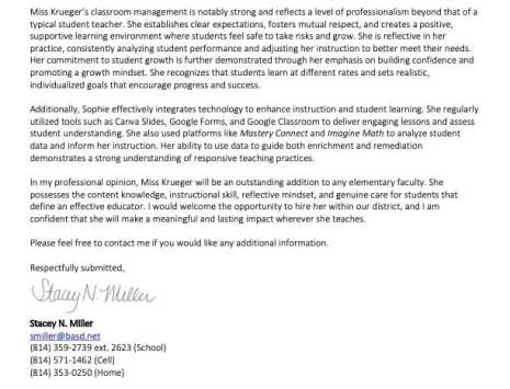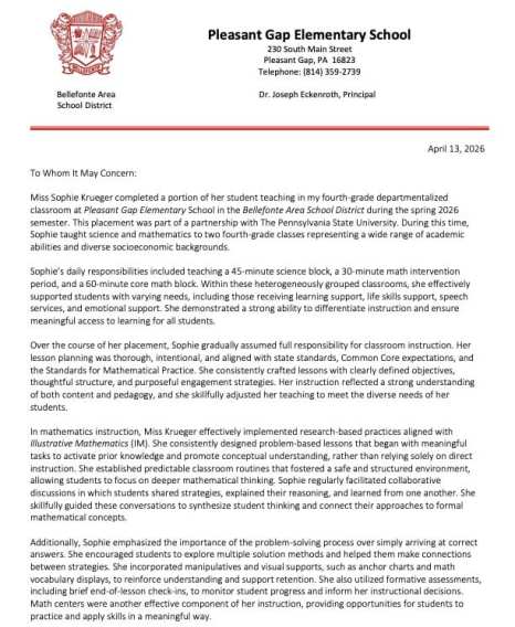 This letter of recommendation was written by one of my mentor teachers, who served as my math, science, and social studies mentor teacher during student teaching. She worked closely with me throughout the semester and observed my instructional growth across multiple content areas. Her recommendation speaks to my teaching abilities, relationships with students, and contributions to the classroom community. A link to view or download the letter is included below.