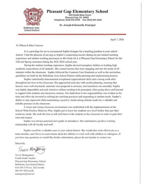 This letter of recommendation was written by one of my mentor teachers, who served as my ELA mentor teacher during student teaching. He had the opportunity to work with me closely throughout the semester and observe my literacy instruction, professionalism, and commitment to student learning. His perspective highlights my teaching abilities, adaptability, and readiness to lead a classroom of my own. A link to view or download the letter is included below.