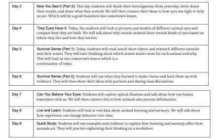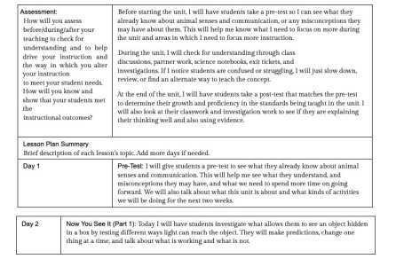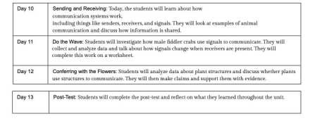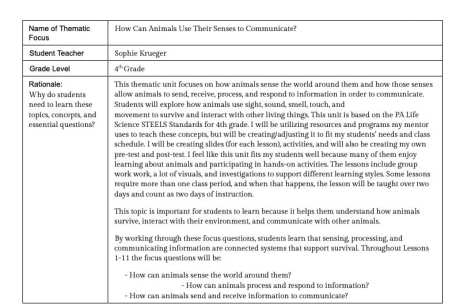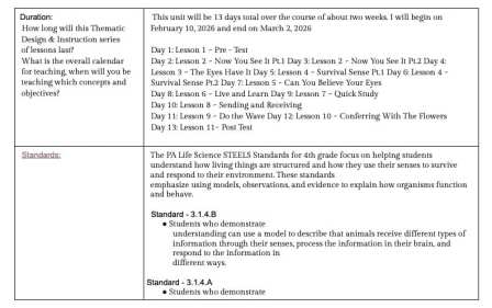 This artifact highlights my ability to create purposeful, standards-aligned instruction through long-term unit planning. For this thematic science unit, I designed a 13-day sequence of lessons focused on how animals use their senses to communicate and survive. The unit was based on Pennsylvania STEELS standards and thoughtfully organized to help students build understanding over time through a clear progression of concepts and skills. Each lesson was planned to build on the one before it so students could deepen their thinking and make meaningful connections throughout the unit.