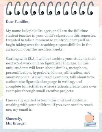 As I began taking over more teaching responsibilities during my student teaching placement, I sent this letter home to families to reintroduce myself and explain the upcoming figurative language unit in ELA. The letter gave families an overview of the concepts students would be learning, including similes, metaphors, personification, and other types of figurative language.