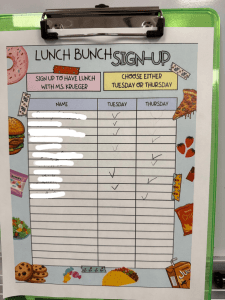 Lunch Bunch was something I introduced to give students a chance to connect with me in a different setting. They signed themselves up on the weekly chart, chose the day that worked best for them, and were always excited when it was their turn. During Lunch Bunch, students talked about school, friendships, things they were proud of, or anything they just wanted me to know about themselves.