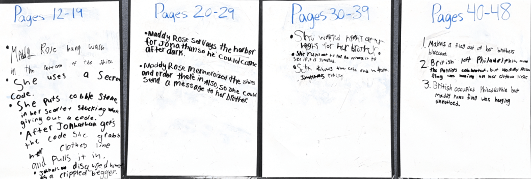 This artifact shows part of our American Revolution unit, where students worked together to analyze The Scarlet Stocking Spy. Students participated in a gallery walk, where they collaborated in groups to break down different sections of the text and identify important actions taken by the patriots. Through this activity, students discussed how individuals gathered information, took risks, and contributed to the larger goal of gaining independence.
