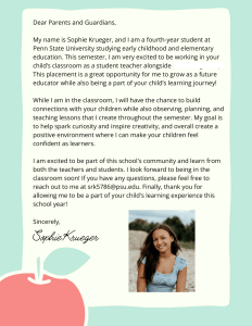 This introduction letter was one I sent home to families at the start of my placement. I wanted parents and guardians to know who I am, why I’m in their child’s classroom, and how much I care about creating a positive learning environment. I also included information about my background, what I value as a future teacher, and how they could contact me if they ever had questions.